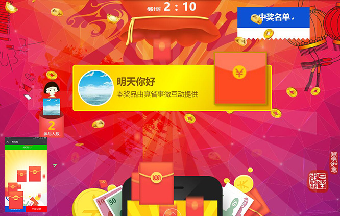 嘉宾使用手机扫描二维码打开抢红包页面,等待微信抢红包大屏幕开始摇红包互动游戏,游戏开始不停点击手机中的红包,抢到的红包后点开红包收钱自动到微信零钱里面,对于 现场观众热情气氛非常嗨起来,还可以设置成关注公众号方式进入摇红包方式,达到推广官方公众号吸粉,提升企业宣传品牌效益。运用微信公众号二维码技术实现抢红包游戏。嘉宾用手机微信扫一扫活动现场的微信二维码,点击关注后打开微信抢红包手机抢红包页面链接,等待大屏幕抢红包红包雨开始参与抢红包。当下微信用户也越来越多,越来越受广大群众的喜爱,微信公众号被很多主办方视为微信加粉与宣传利器,并且这都是最真实,最有效的用户。来宾对着主办方的微信公共二维码轻轻一扫,输入相关信息,即刻完成微信关注。此外,在活动、聚会,派对,路演促销等各种场合,微信摇红包也已成为最潮的微信游戏新玩法。 主办方将微信公众号二维码打印出来,放在会议入口处,供嘉宾扫一扫,公众号可以做到直接推送抢红包链接信息方式,或者发送关键字推送抢红包链接信息方式给嘉宾,嘉宾只要点击抢红包链接就可以参与到游戏当中。